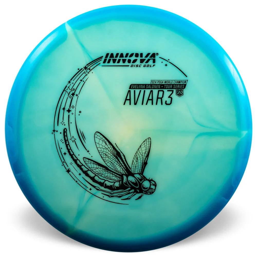 Innova has taken the #1 putter in disc golf and made it the ideal driving putter. Built for speed and less carry, the flat top Aviar3 is designed for controlled tee shots and aggressive upshots. This Proto Glow blend give you a confident grip and glows bright as heck! Stamp color may vary.