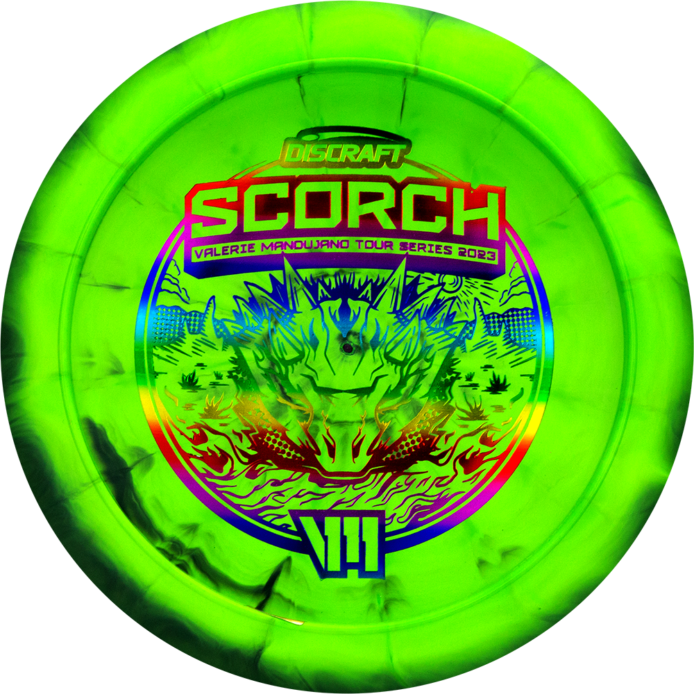Beginner to Intermediate players will find the Scorch an easy to throw straight flier that will fight to come back, even in the wind, while Advanced and Professionals can expect high-speed turn and a late finish producing amazing distance. Please note that due to the swirl of Z Swirl plastic that an individual disc may be a mix of different colors. The color listed is what we feel best describes the disc. Stamp color will vary.
