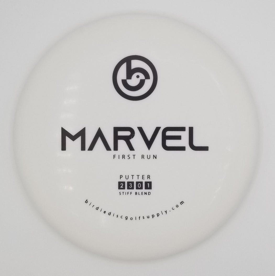 • The Marvel is Birdie Disc Golf's first disc release of their own. Pegged as a straight to slightly overstable putter, this beadless wonder should help make your putting game tight. This putter does well for spin putting, push and hybrid style putting as well. No wonder they call it the Marvel. Stamp color will vary.