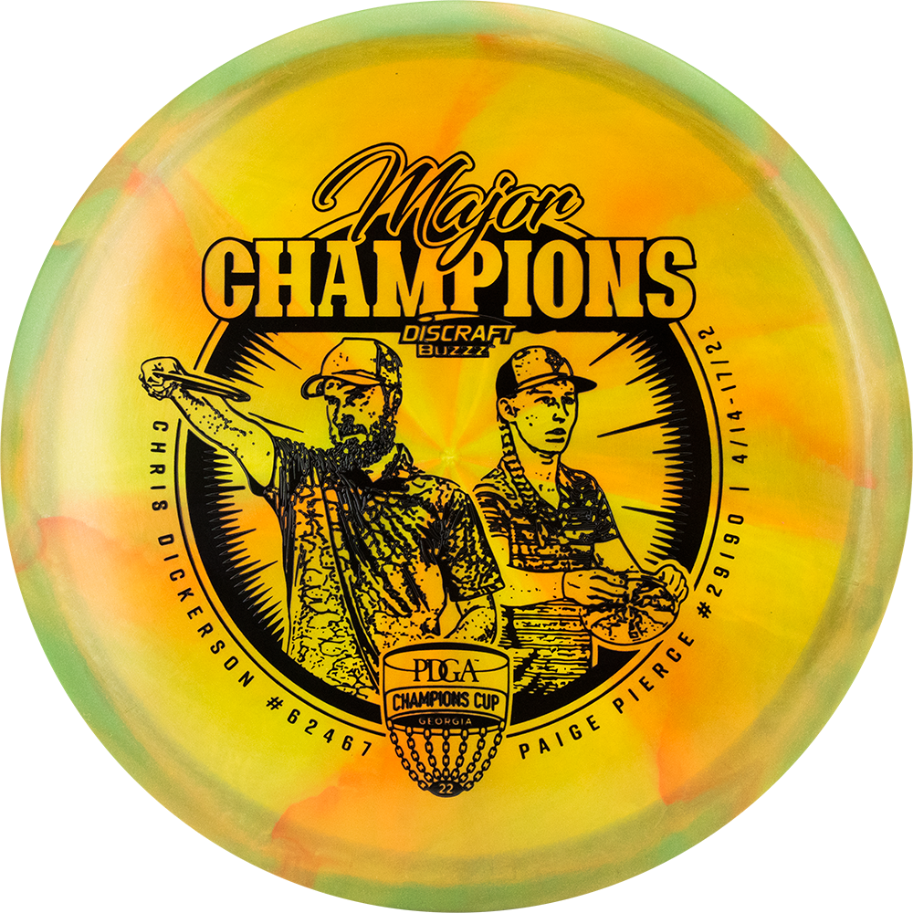 Limited Edition Z Swirl Buzzz celebrating Chris Dickerson and Paige Pierce on their 2022 Champions Cup wins. Please note that due to the swirl design there may be multiple colors swirled in to one disc. The color listed is what we feel describes the disc best but please expect some variations. Stamp color will vary.