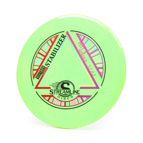 This is the second putter from Streamline Discs and is the overstable compliment to the Streamline Pilot. The Stabilizer has a similar hand feel and depth as the Neutron Pilot, but with a slightly raised shoulder and more pointed nose that produces a flatter and more stable putter. The Stabilizers defining flight characteristic is straight flights with minimal turn, into a strong finishing fade for point and shoot accuracy on the approach. Stamp color will vary.