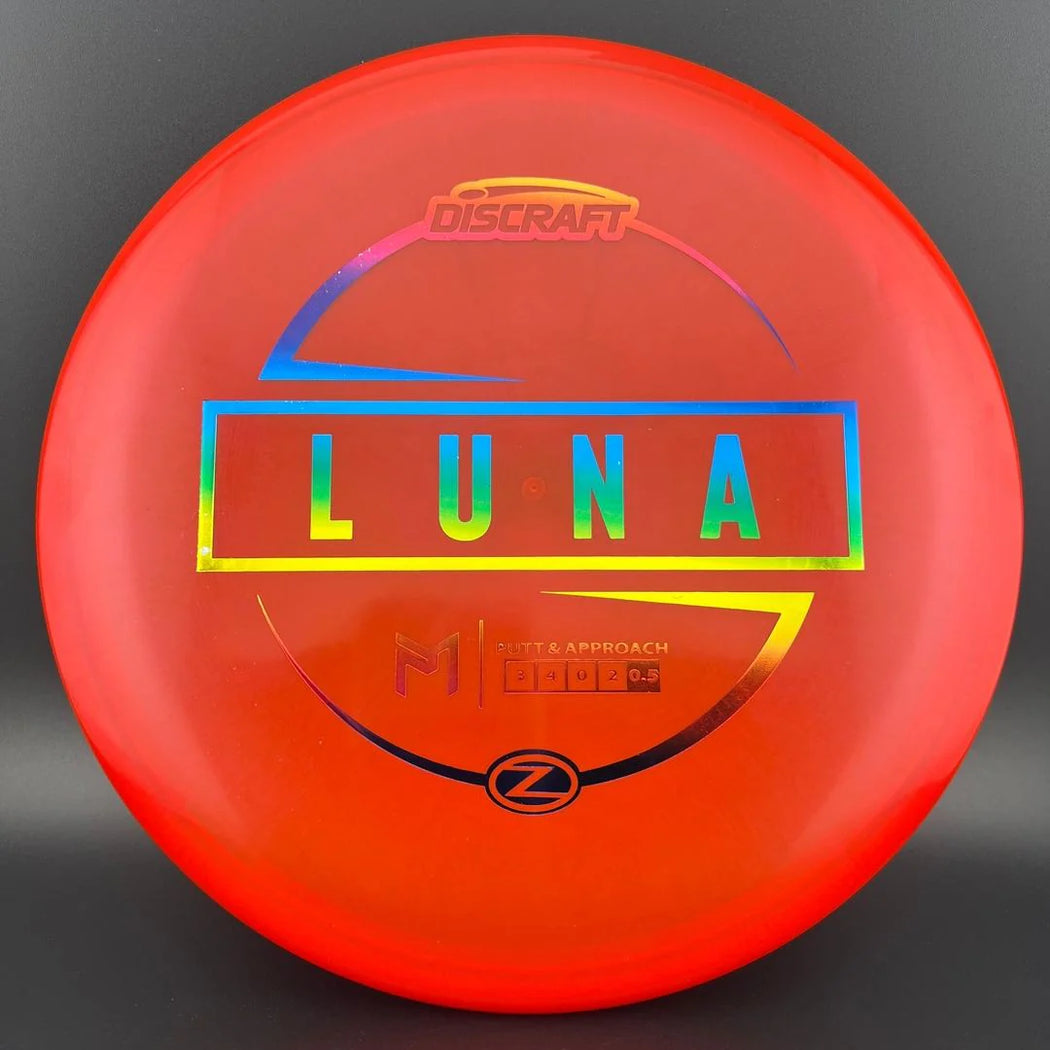 The Z line Luna, durable plastic combine with a reliable throwing putter flight. Z line plastic adds a little bit of glide and stability compared to other Lunas. Thrown well the Luna will fly dead straight with a slight amount of fade.