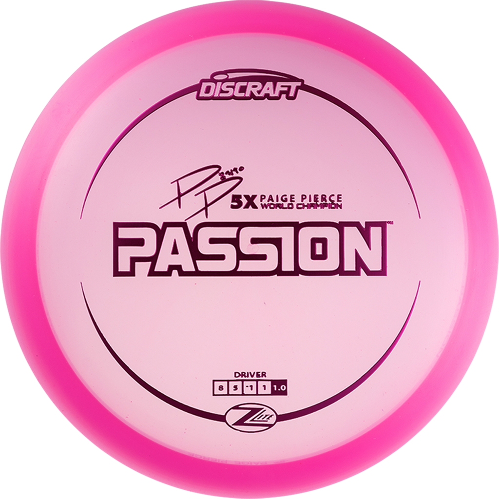 • This 8 speed driver offers a neutral flight and plenty of glide to give arms of any speed great control. Paige designed the Passion specifically for lighter weights for throwers of all ages and skill levels. Stamp color will vary.